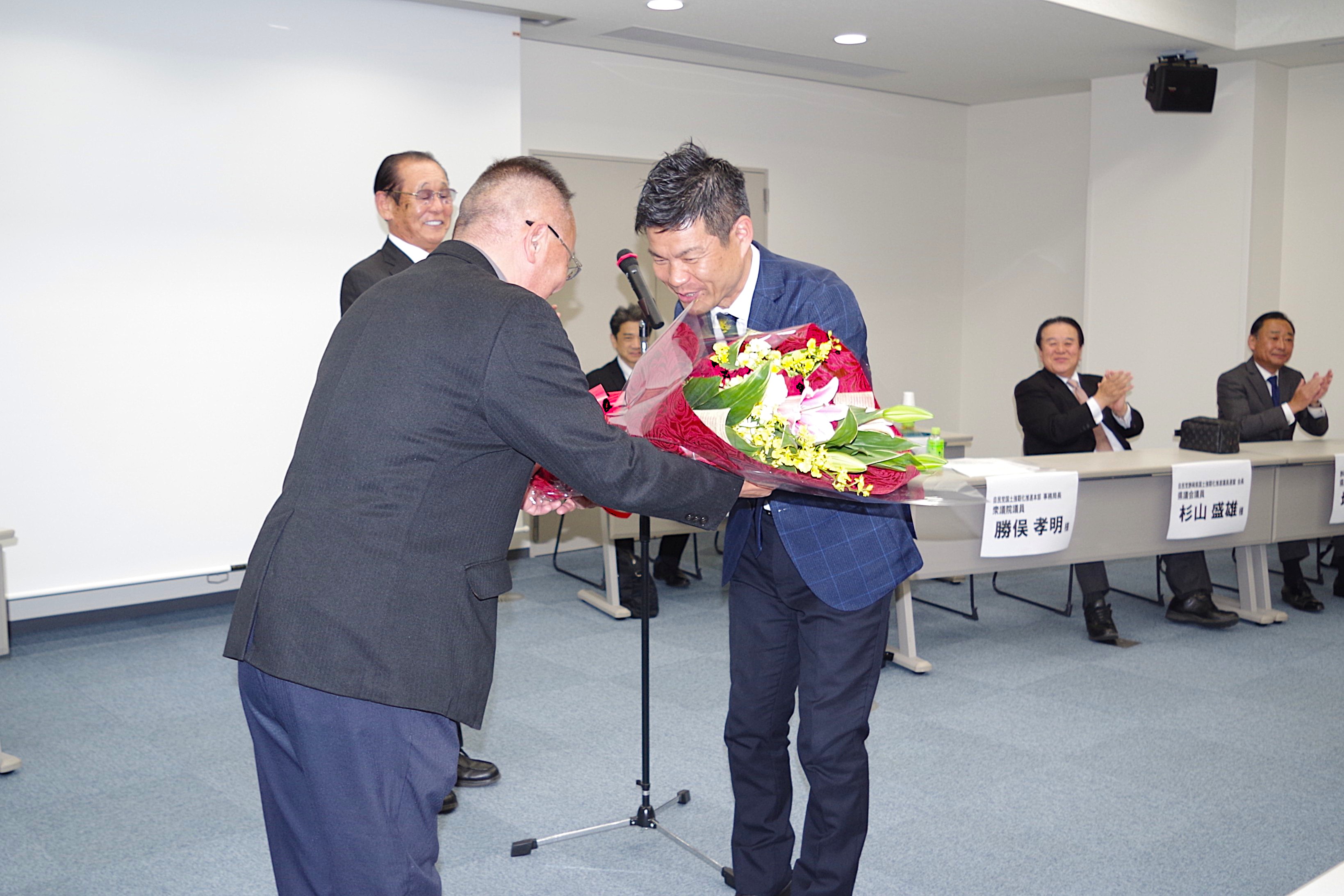 また、年次大会終了後に開催されたセレモニーでは、7月に予定される参議院議員選挙に立候補予定で、当連盟及び宅建協会の推薦する、現職の牧野京夫参議院議員に対し、推薦状が交付されました。